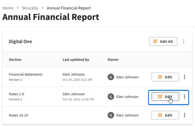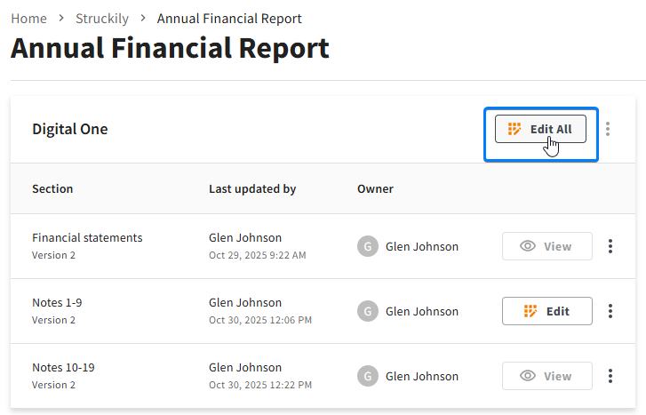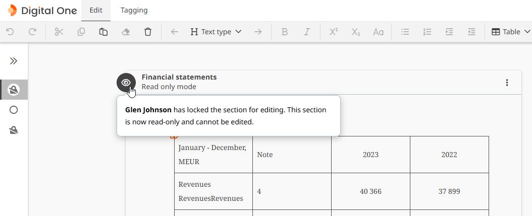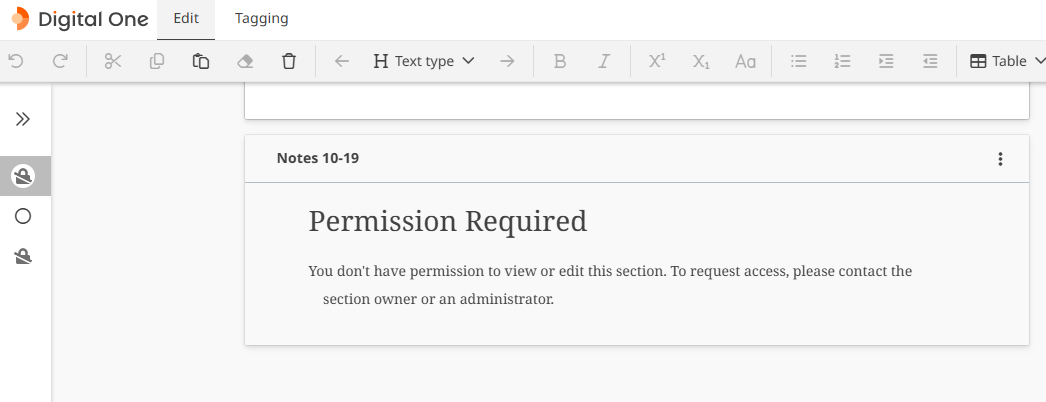Depending on permissions and whether a section is currently locked by another user, the different sections will either display as: