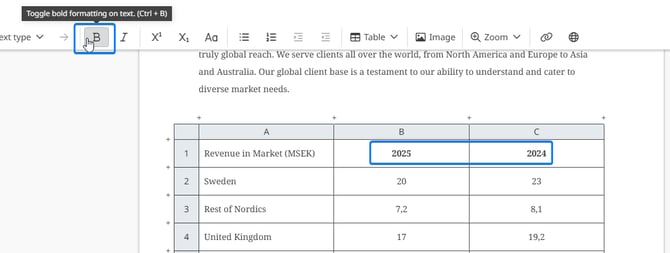 At the top of the page, you'll find a toolbar where you can adjust text formatting, add subscript or superscript, and create lists and tables.