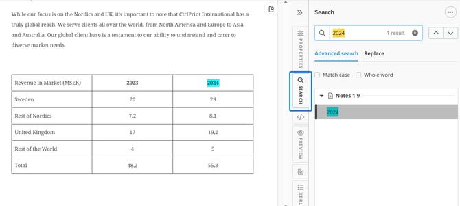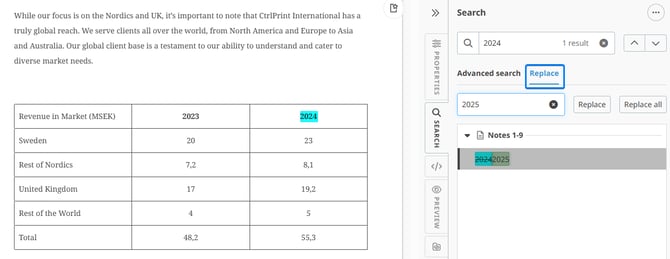 To replace found content, switch to the Replace tab and enter your new text. You can choose Replace to update one instance, or Replace all to update every instance in the section.