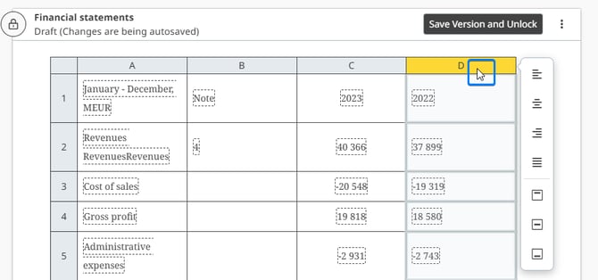 - To adjust alignment, click the column and choose your preferred alignment option.