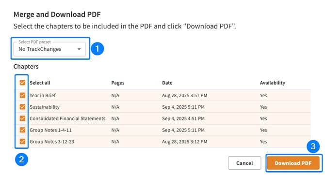 - Select the chapters you want to include in the PDF. You can also click "Select all" to select every