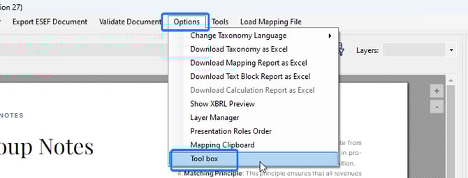 - Next, open the new chapter in the Tagger and go to the Tool box, available from the Options menu.