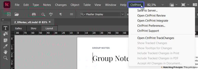 A menu called "CtrlPrint" is added to the menu bar in InCopy/InDesign when the plug-ins are installed. This menu contains options for saving documents to the server and using additional features such as; TrackChanges, Review and Integrate.
